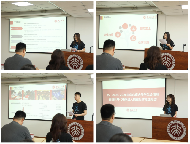 接下来,大会进入选举议程。2025-2026学年信息管理系学生会执委会主席候选人顾舒文,副主席候选人李佳、海岩,北京大学学生会信息管理系常代表候选人熊鑫怡依次发表竞选演说。四位候选人回顾了各自的学生工作经历,阐述了当选后的工作理念和思路规划,表达了为信管同学提供更优质、更贴心服务的坚定决心。发言结束后,候选人现场回答了学生代表的提问。经无记名投票选举,顾舒文当选2025-2026学年信息管理系学生会执委会主席,李佳、海岩当选副主席,熊鑫怡当选北京大学学生会信息管理系常代表。
