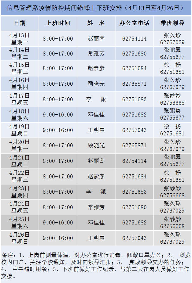 信息管理系疫情防控期间错峰上下班安排(4月13日至4月26日)