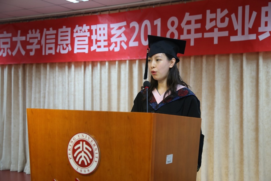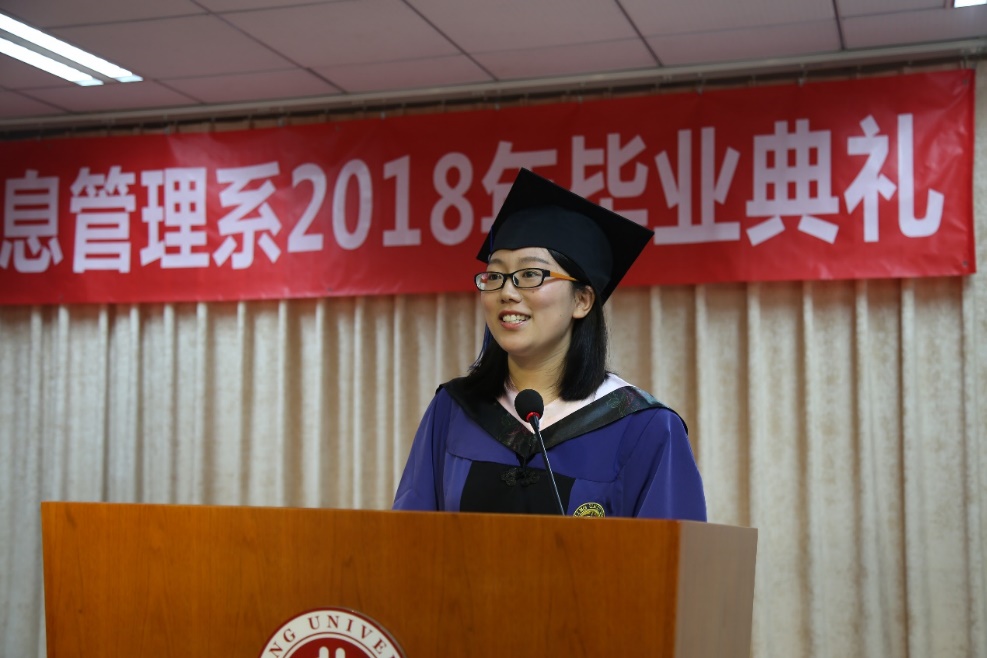 2014级本科生严心月和2016级硕士研究生姚玲苗作为毕业生代表依次发言。严心月回顾了在大学四年生活的美好片段,分享了自己在信管学习的所思所得,并向辛勤付出的老师与家长、四年陪伴的同学表达了感谢,号召毕业生们不忘初心,携勇气一路前行。