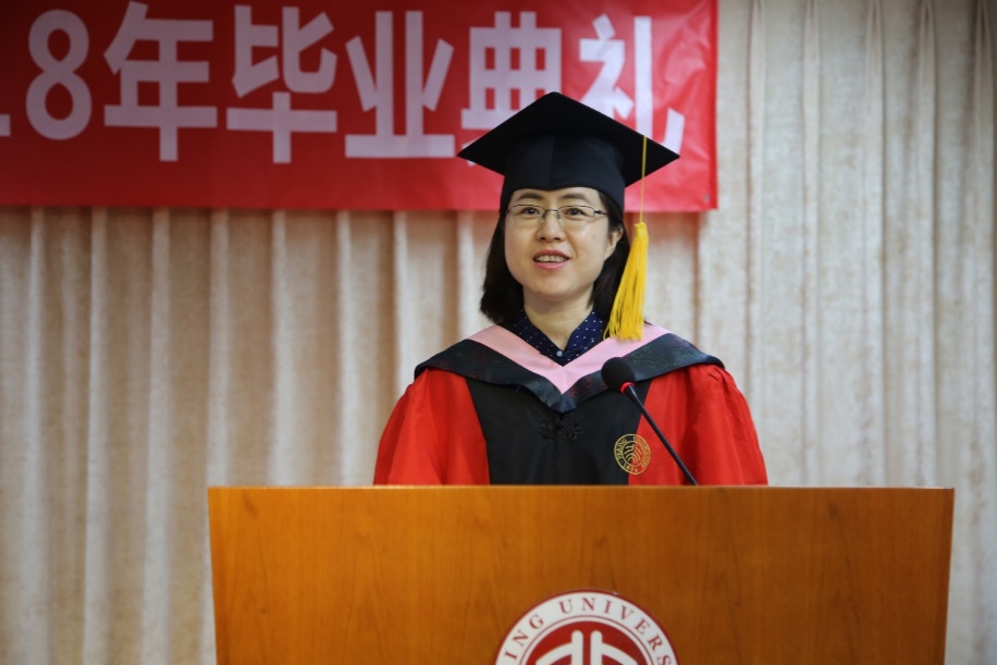 2014级本科生班主任李世娟作为教师代表向同学们送上了毕业祝福。她回忆了与同学们共同度过的四年美好时光,为大家送上叮咛与期许:一是要培养成长型思维,把每一次失败都当成一堂课;二是要培养并坚守受益终生的兴趣爱好,持续阅读,坚持锻炼;三是不忘初心,使社会因我而更美好,牢记北大人的使命。她还嘱托同学们要继续努力地学习,真诚地相爱,认真地生活。