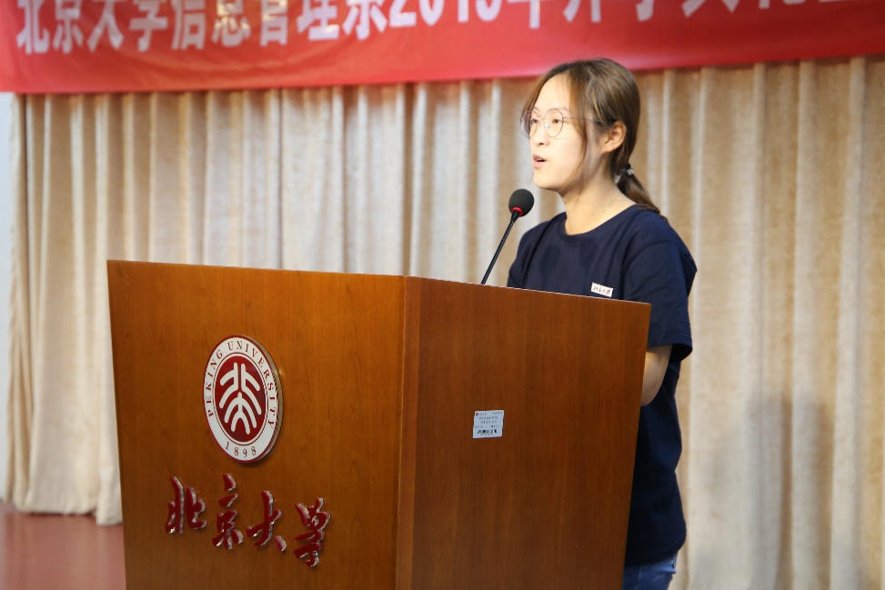 2019级本科新生金芮先同学作为新生代表发言。金芮先同学回忆了在军训中感受到的纯洁友谊、严明纪律、健康体魄以及家国情怀,也回忆了自己初入北大信管时,感受到的来自师长和同学们的无微不至的关怀。金芮先同学积极表达了希望自己这代人能够承担起作为新时代青年的责任与担当,以“只有奋斗过,才叫做青春”勉励自己和同学们。