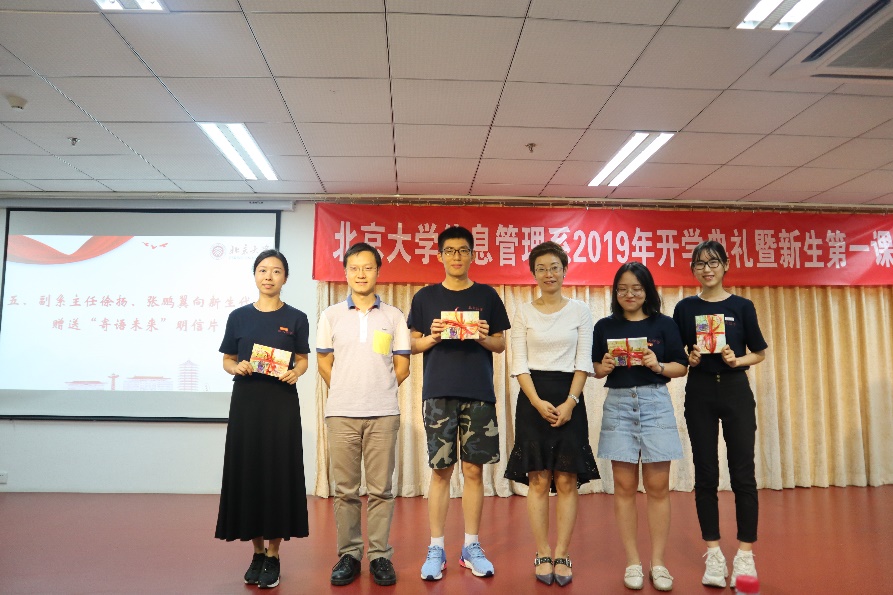 紧接着,副系主任徐扬老师、张鹏翼老师向新生代表赠送“寄语未来”明信片,让同学们写下对自己对未来的期许,始终做到不忘初心。