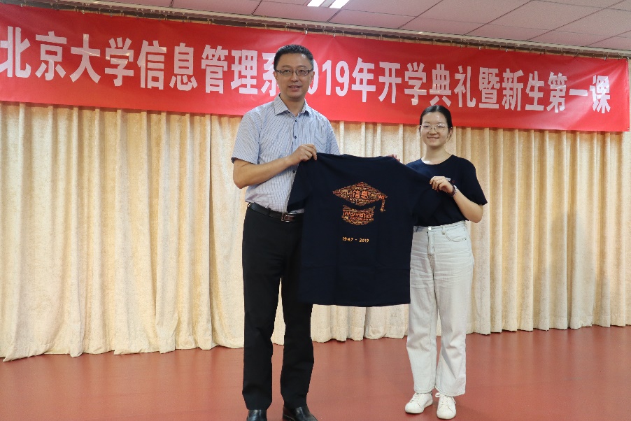 在孙文先生发言结束后,信息管理系学生代表、2019级硕士新生刘千慧同学向孙文先生赠送信息管理系2019年纪念版文化衫。