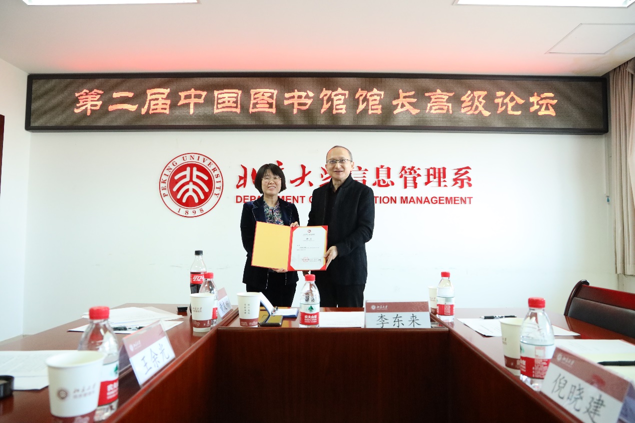 张久珍教授对各位馆长的支持表示感谢,希望能够加强理论和实践的融合,也希望馆长论坛能打造一个平台,让大家畅所欲言,集合力量,发出一些回应时代需要的声音。随后,张久珍教授为第二届中国图书馆馆长高级论坛轮值主席、东莞图书馆李东来馆长颁发聘书。
