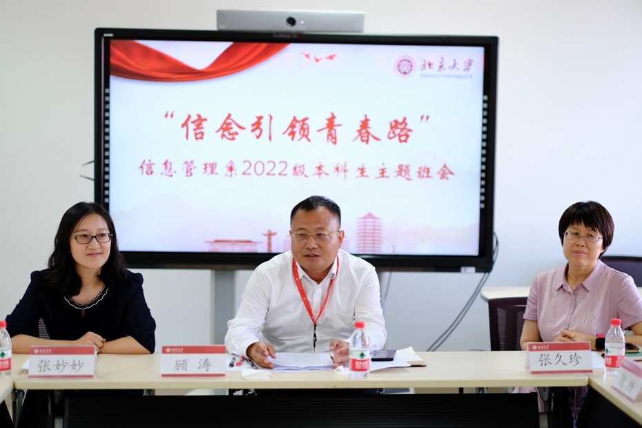 张久珍对顾涛担任信息管理系第二班主任表示感谢,并再次欢迎2022级本科生来到北大信管就读。张久珍介绍了信息管理系75年历史的深厚积淀、图情学科发展及信息管理系目前的建设情况。她指出,信息的有效获取和利用是长期以来的重要话题,图情学科的发展进步为其它学科的发展提供了丰富的数据资源。不久前召开的“首届全国出版学科共建工作会”为信息管理系的发展带来了新的增长点。信管学子将在北大学有所成,成为国家和社会的栋梁之才。