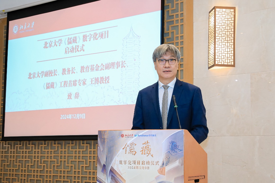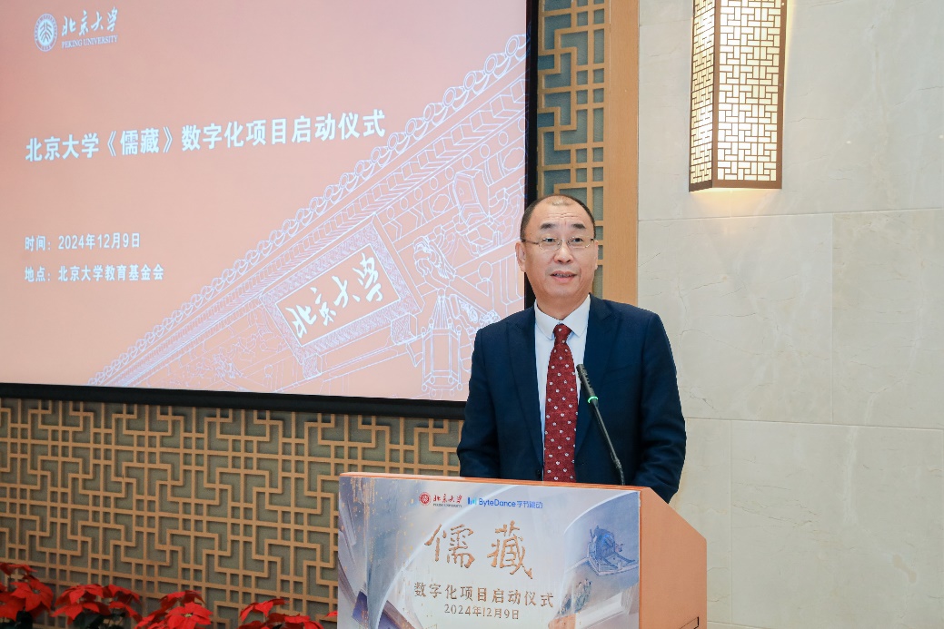 12月9日下午,《儒藏》数字化项目启动仪式在北京大学教育基金会北大之友报告厅举行。中宣部出版局副局长、全国古籍办副主任杨芳,教育部社科司二级巡视员马建通,北京大学党委书记、教育基金会理事长郝平,副校长、教务长、教育基金会副理事长、《儒藏》工程首席专家王博,副校长、总务长董志勇,党委副书记、统战部部长、副教务长姜国华,北京字节跳动公益基金会理事长张羽,执行理事长、秘书长乔栋,副理事长杨洁,《儒藏》“精华编”总编纂安平秋,执行总编纂李中华、魏常海出席启动仪式。参加启动仪式的还有《儒藏》中心和相关院系部门的老师和同学们。启动仪式由姜国华主持。