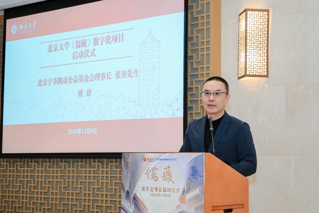 张羽介绍了字节跳动与北京大学在古籍领域的合作情况,并表示,字节跳动公司通过公益捐赠及提供识典古籍智能整理平台的技术支持全本《儒藏》的编纂,旨在帮助北大更高效便利地开展《儒藏》的编纂与研究工作。接下来,字节跳动将充分发挥自身的能力,根据《儒藏》整理的需求,进一步优化产品功能,支持好《儒藏》工程,与更多机构及专家们携手同行,持续助力古籍修复、数字化和活化,共同为古籍保护与传承创造更大的价值。