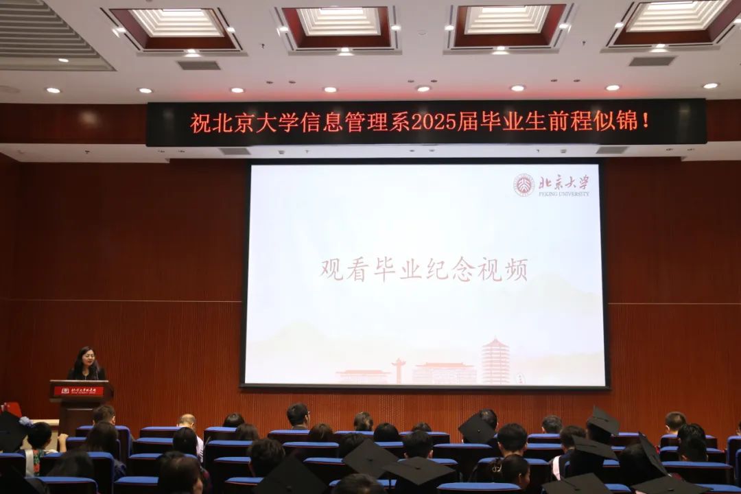 在庄严的国歌声中,毕业典礼正式开始。毕业典礼现场毕业纪念视频一帧帧播放,北大的时光也在眼前慢慢重现,带领大家一起回望那些闪光的日与夜。从未名湖的清波荡漾到博雅塔下的光影流转,从图书馆的伏案身影到系楼前的匆匆步履,一幅幅画面唤起了无数熟悉的回忆。视频中,老师们送上了最真挚的寄语,那一句句叮咛与祝愿,是告别,也是牵挂。而毕业生们也以快问快答的方式,真诚地诉说着对信管、对燕园的留恋:最难忘的课程、最熟悉的角落、最想推荐的食堂、最想打包带走的东西……每一句话背后,都是光阴的缩影。那些走过的路、看过的风景、留住的经历,如今都成了心底最柔软的记忆。此刻说再见,也是在心中悄悄说一声谢谢。