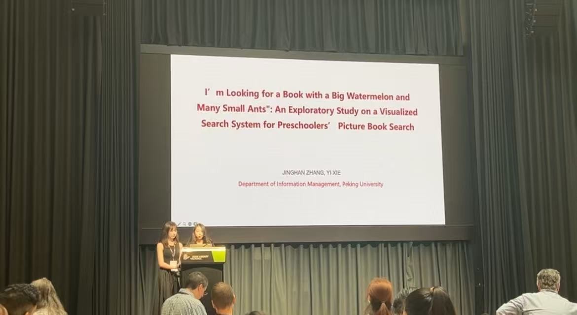 信息管理系本科生张景涵、谢艺、马郡阳、郑智涵、翟珅康与王翩然老师合作了题为《I’m Looking for a Book with a Big Watermelon and Many Small Ants": An Exploratory Study on a Visualized Search System for Preschoolers’ Picture Book Search》的论文,并在会议现场进行了学术报告。该研究关注学龄前儿童的图画书查询行为,根据学龄前儿童进行绘本查询时的认知机制和查询策略,开发了儿童友好的面向学龄前儿童的图画书查询系统,并进行了可用性测试。通过本次会议,本系师生广泛了解学科前沿,学习国内外优秀学者的研究经验,积极与来自世界各地的学者进行分享与交流。他们不仅拓宽了学术视野、提升了学术水平,还对研究方向有了更深入的把握。