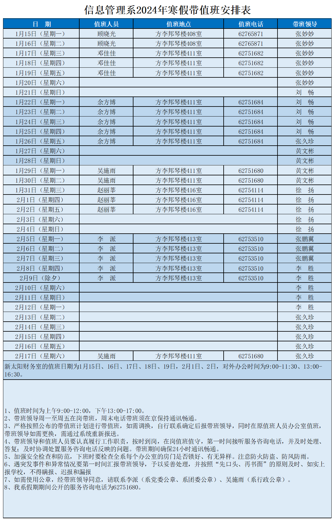 信息管理系2024年寒假带值班安排表