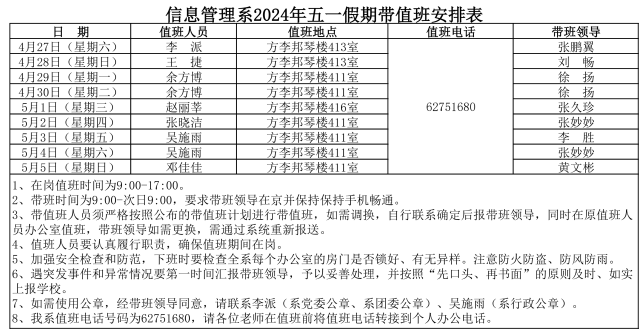信息管理系2024年五一假期带值班安排表