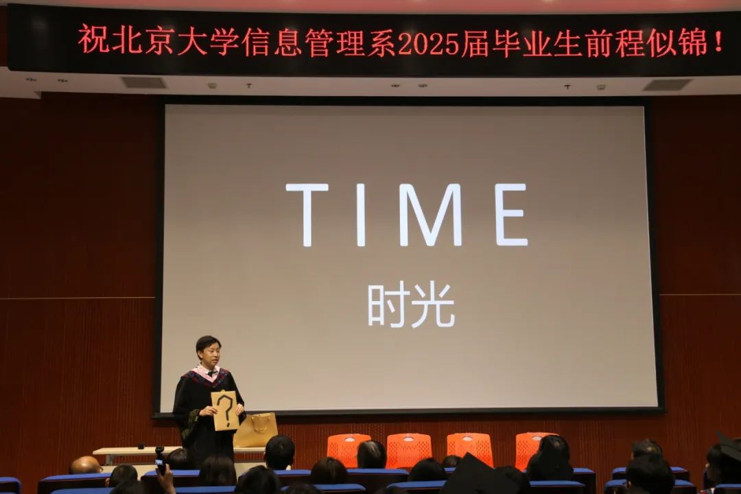 在庄严的国歌声中,毕业典礼正式开始。毕业典礼现场毕业纪念视频一帧帧播放,北大的时光也在眼前慢慢重现,带领大家一起回望那些闪光的日与夜。从未名湖的清波荡漾到博雅塔下的光影流转,从图书馆的伏案身影到系楼前的匆匆步履,一幅幅画面唤起了无数熟悉的回忆。视频中,老师们送上了最真挚的寄语,那一句句叮咛与祝愿,是告别,也是牵挂。而毕业生们也以快问快答的方式,真诚地诉说着对信管、对燕园的留恋:最难忘的课程、最熟悉的角落、最想推荐的食堂、最想打包带走的东西……每一句话背后,都是光阴的缩影。那些走过的路、看过的风景、留住的经历,如今都成了心底最柔软的记忆。此刻说再见,也是在心中悄悄说一声谢谢。