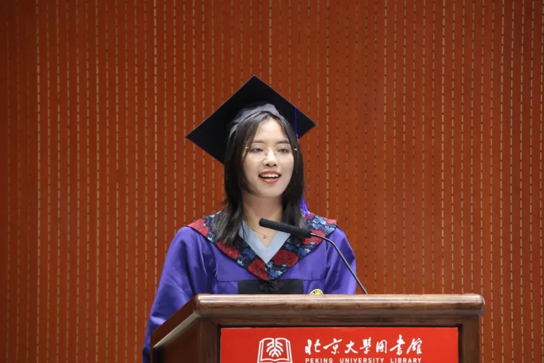 随后,优秀毕业生代表,2023级情报学硕士生王睿登台发言,以“回望”与“展望”为主题,与大家分享自己在北大信管的求学旅程。在“回望”中,她回忆了课堂内外的专注与坚持、核对数据的细致与严谨,也感念于师长们“润物细无声”的引导和点拨,更动情讲述了与同学们携手并肩、彼此守望的温暖情谊;在“展望”中,她以豪情与担当,表达了对未来的坚定信心与赤诚选择——愿以所学服务国家所需,将青春写进时代的答卷。