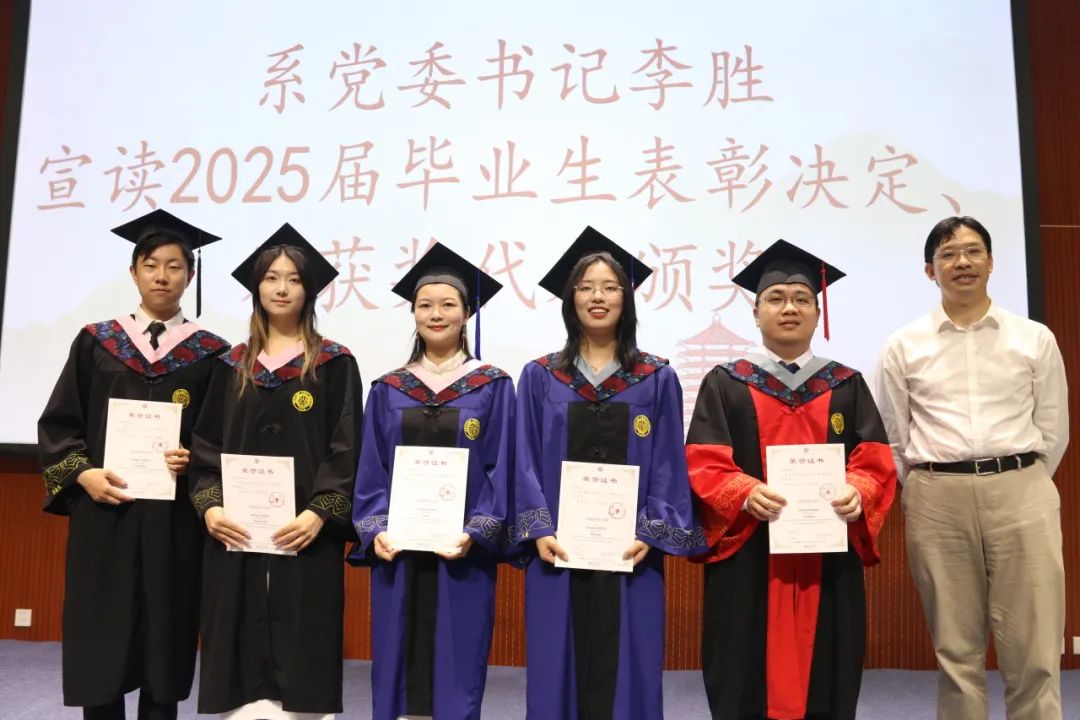 系党委书记李胜宣读表彰优秀毕业生的决定,授予陈丞、杜咏曦等16名同学“北京大学优秀毕业生”荣誉称号,授予李奎良、王雨辰等5名同学“北京市普通高等学校优秀毕业生”荣誉称号。李胜老师为获奖代表颁发荣誉证书,并表示热烈祝贺,勉励同学们要忠于祖国、忠于人民,立鸿鹄志、求真学问、练真本领,勇做走在时代前列的奋斗者、开拓者、奉献者。