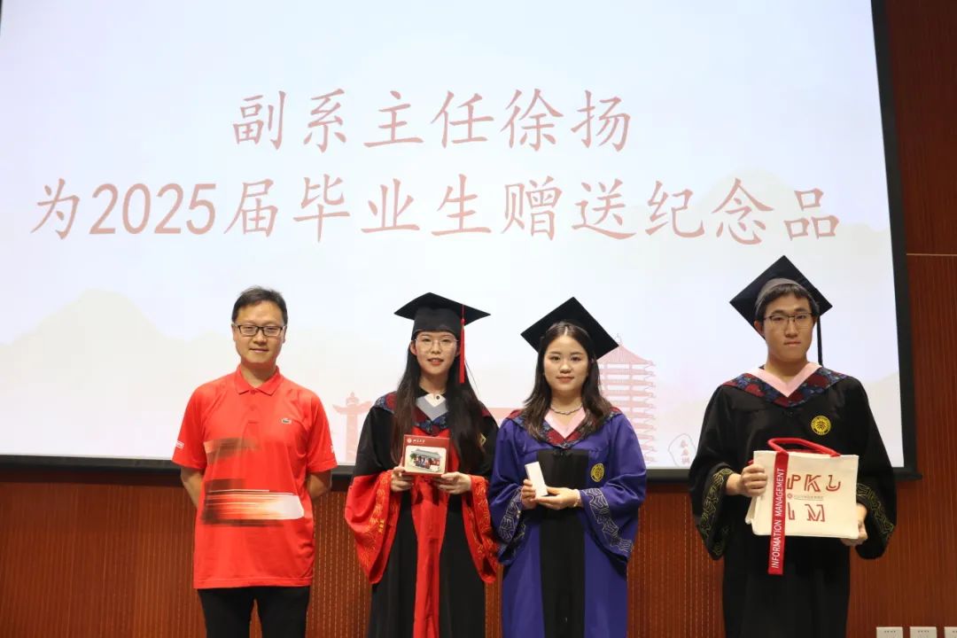 随后,副系主任徐扬为2025届毕业生赠送毕业纪念品。索天艺介绍了为毕业生设计的纪念品——刻有校门、人偶和姓名的专属积木、魔方充电线和帆布袋。她也深情寄语毕业生们,无论身在何方,都要记得常回“家”看看,北大信管永远是大家温暖的港湾。