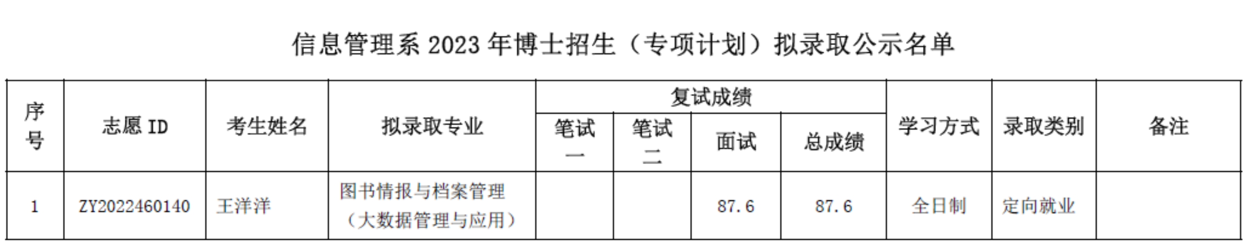 信息管理系2023 年博士招生(专项计划)拟录取公示名单
